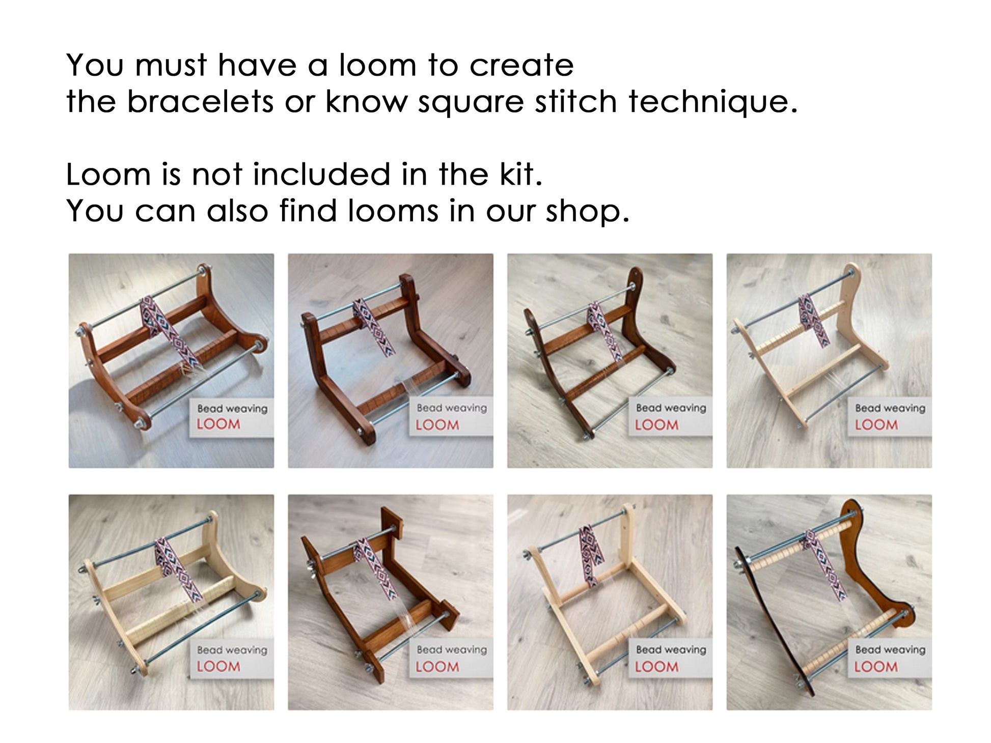 You must have a loom to create the bracelets or know square stitch technique. Loom is not included in the kit. You can also find looms in our shop.