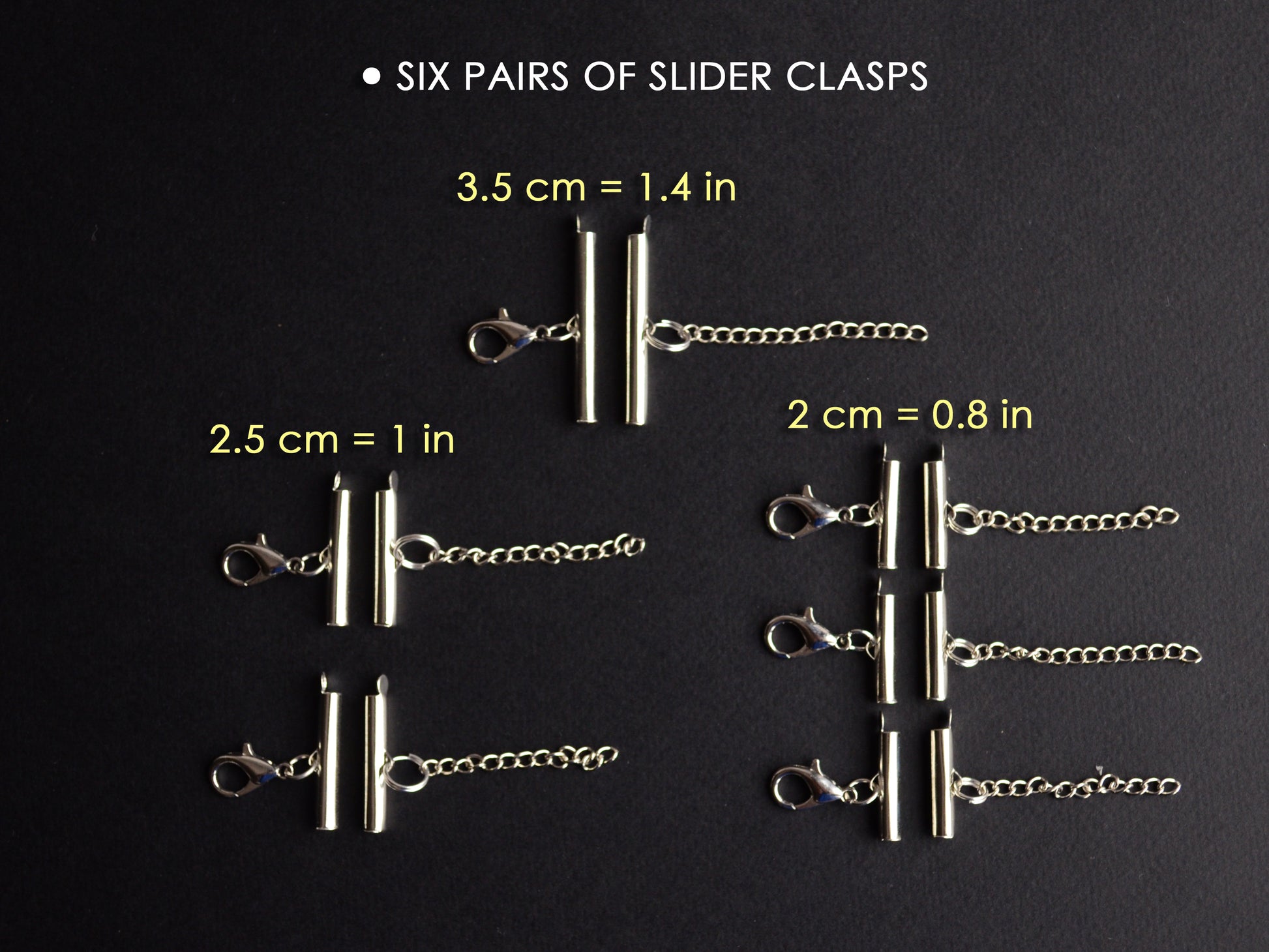 - 6 pairs of different size slider clasps ends (1 pcs - 3,5 cm; 2 pcs - 2.5 cm; 3 pcs - 2 cm)